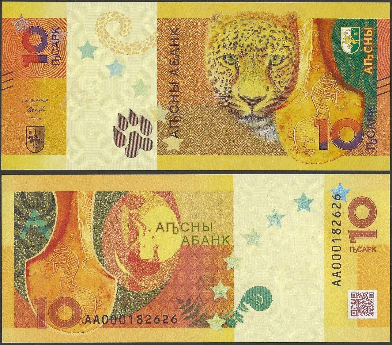 F : Abkhaz text; coat of arms of Abkhazia; apsars symbol; seven 5-pointed stars; paw print; face of leopard; ancient bronze axe with primitive drawing of animal; coat of arms of Abkhazia.