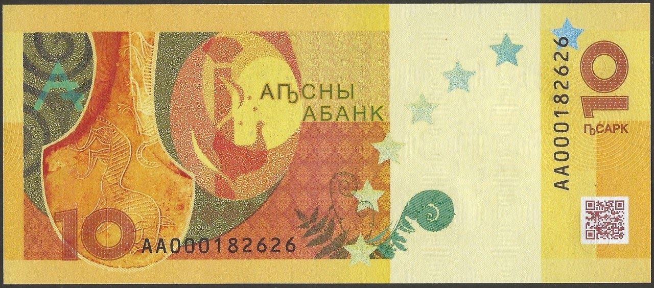 B : Abkhaz text; apsars symbol; ancient bronze axe with primitive drawing of animal; stylized upper part of alabasha (traditional Abkhaz military and hierarchical staff); fern; seven 5-pointed stars; QR-code.