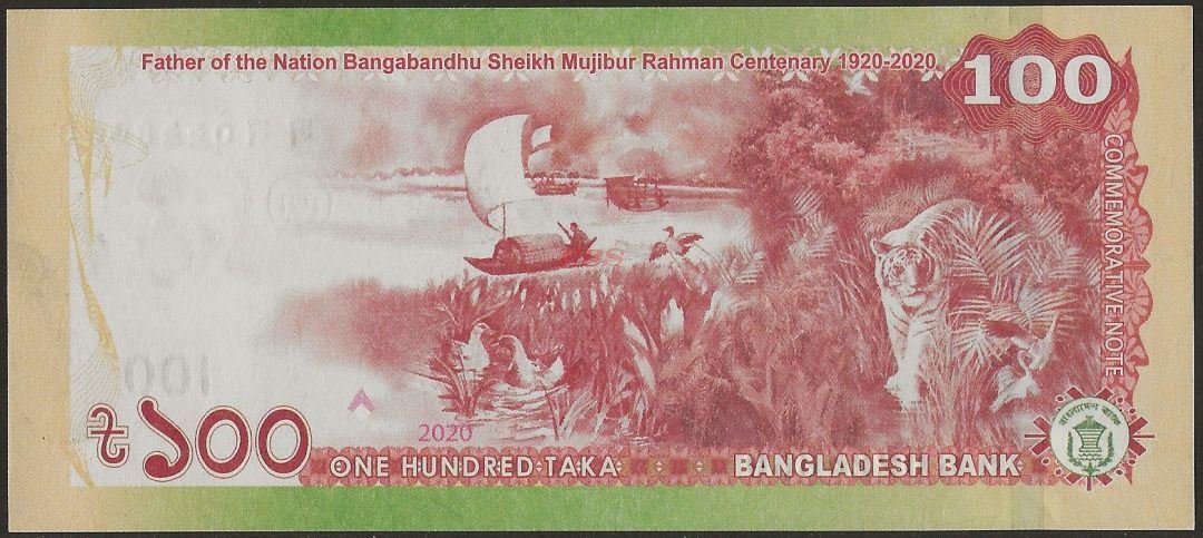 B: Bengali and English text; boats on river; tiger in jungle; bank logo. Kinetic StarChrome windowed security thread.