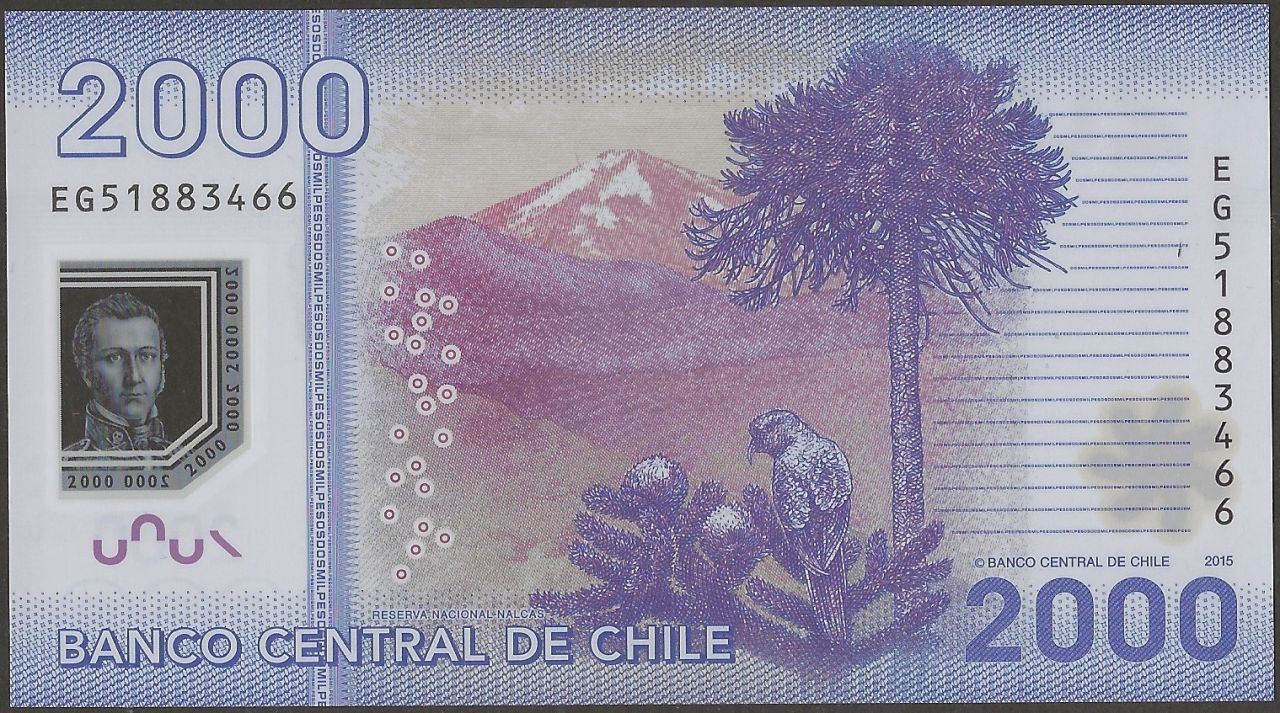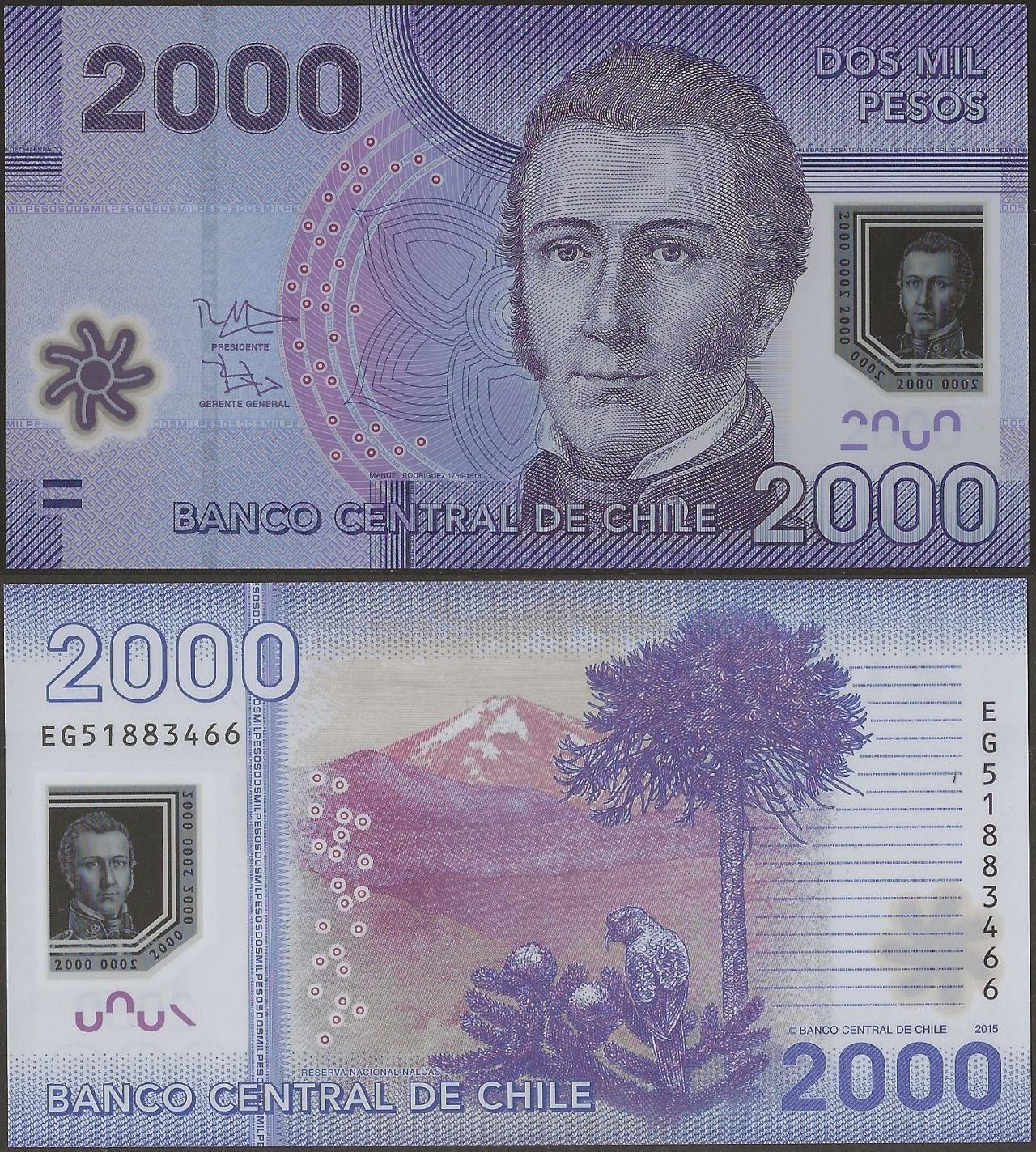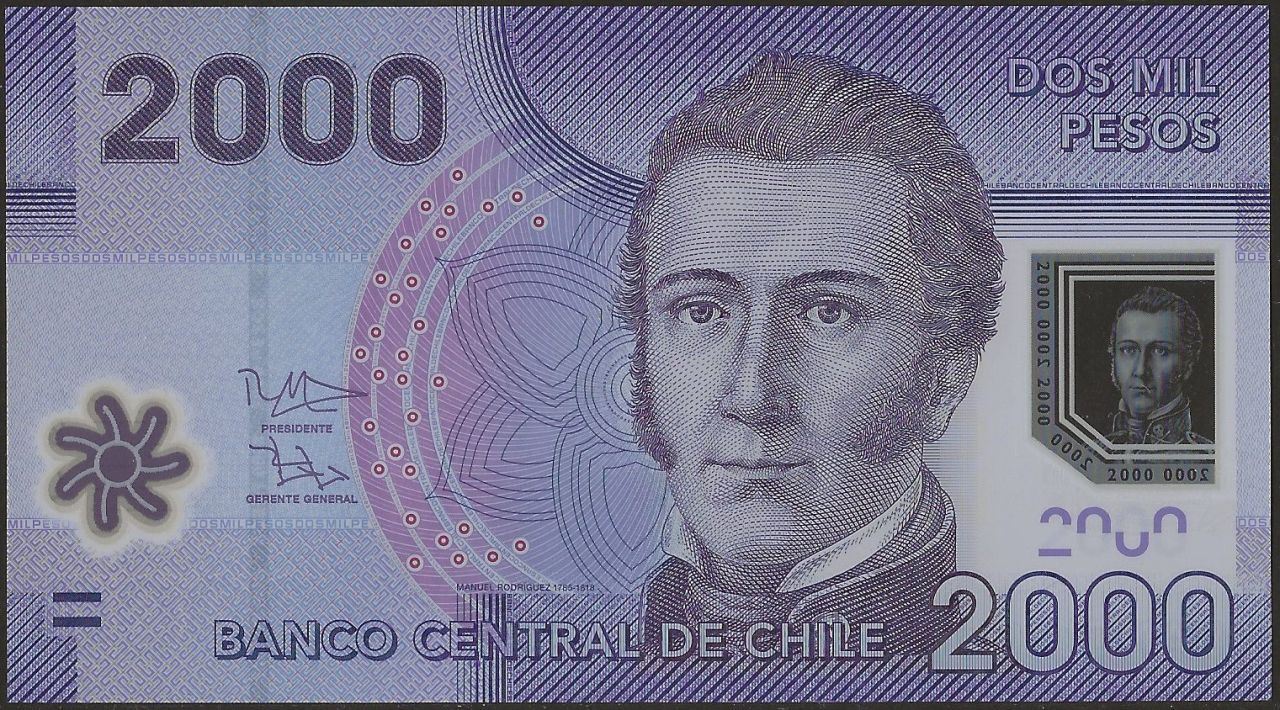 F: Spanish text; stylized sun in red-to-gold OVI; stylized corazón del copihue (heart of Chilean bellflower); lawyer and guerrilla leader, Manuel Rodríguez Erdoíza; denomination as registration device.