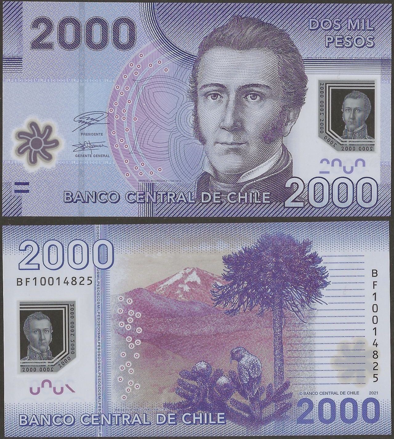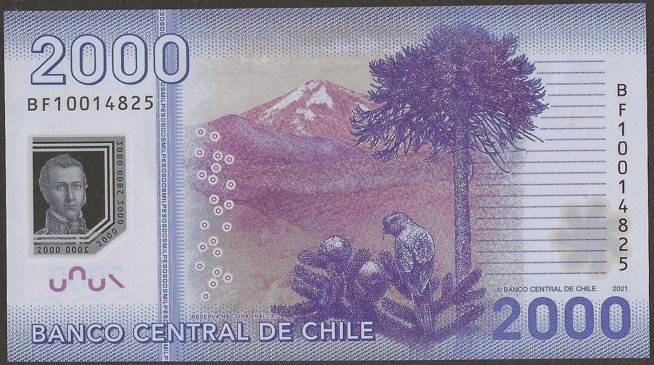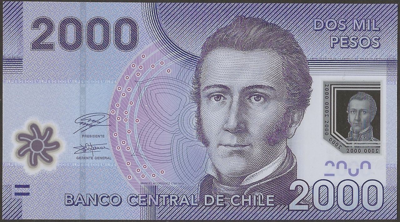 F: Spanish text; stylized sun in red-to-gold OVI; stylized corazón del copihue (heart of Chilean bellflower); lawyer and guerrilla leader, Manuel Rodríguez Erdoíza; denomination as registration device.