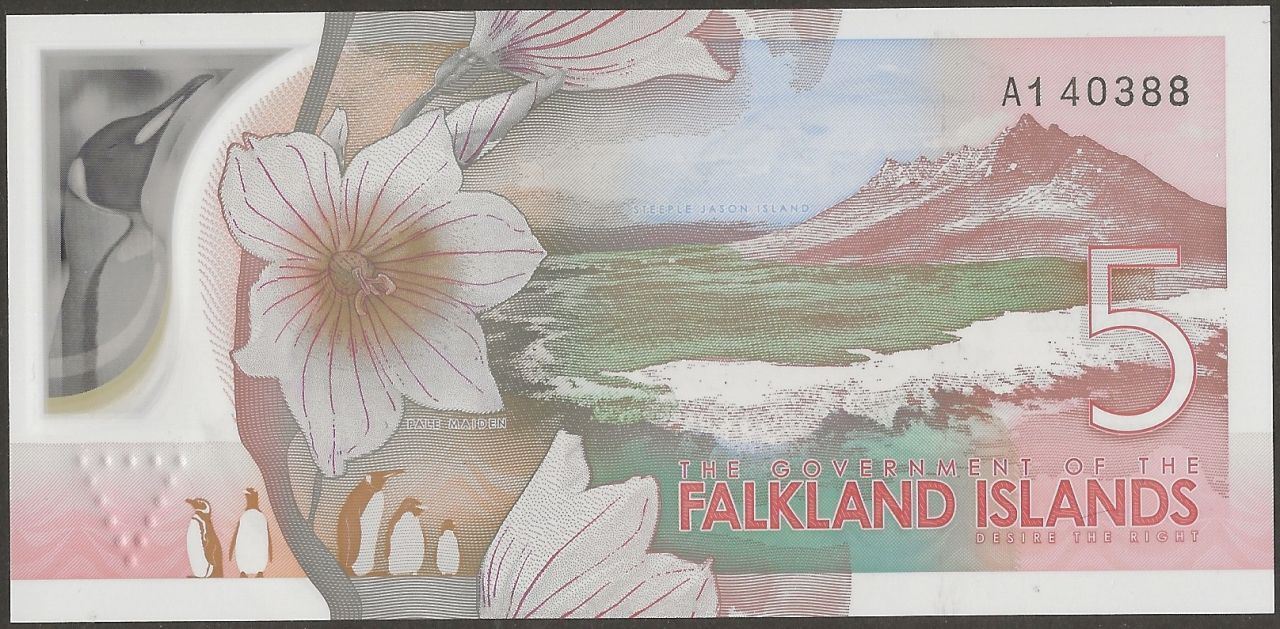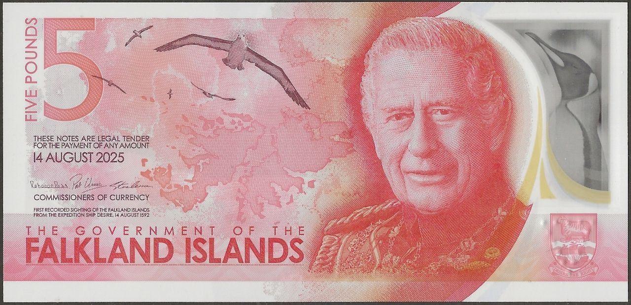 F: five black-browed albatrosses in flight; map of the Falkland Islands; King Charles III; coat of arms