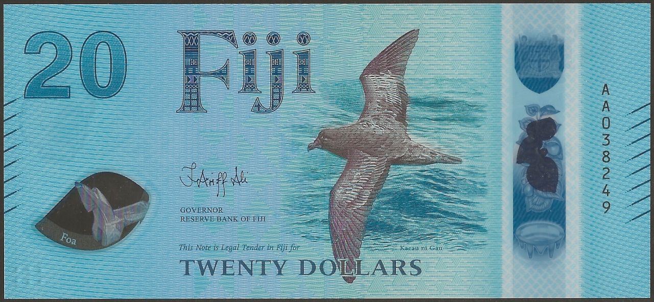F : Kacau ni gau (Fiji petrel) bird flying over waves; Fijian coat of arms, leaves, kava bowl