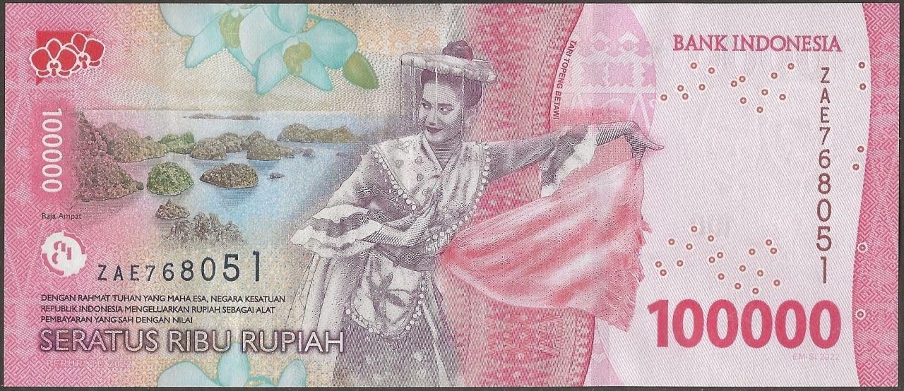 F : Indonesian text; moth orchid flower; 1st president, Sukarno; map of Indoensia; 1st vice-president, Mohammad Hatta; coat of arms; bank logo as registration device.