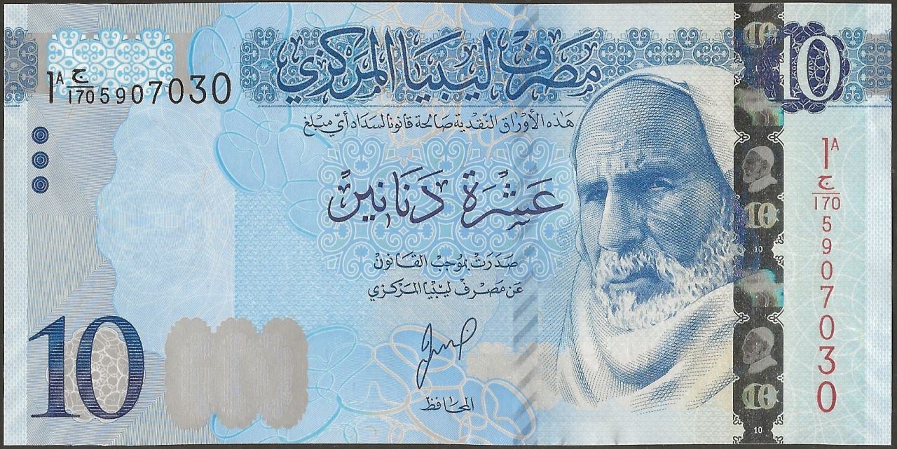 Holographic stripe with Omar Al-Mukhtar, rearing horse, crescent and star, and 10. Windowed security thread with demetalized Arabic characters and horse