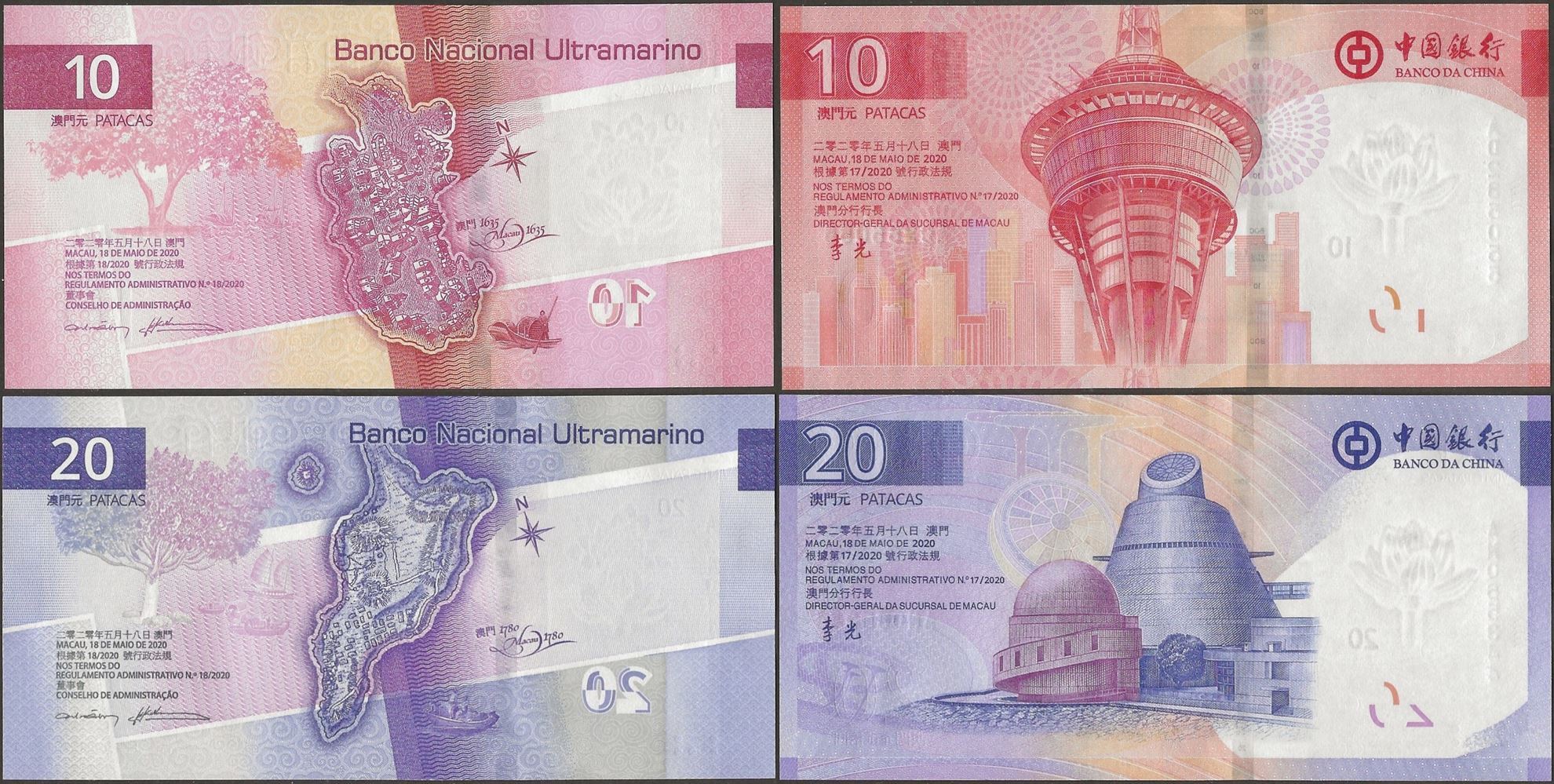 B: Chinese and Portuguese text; skyline of large buildings; Macau Science Center; bank logo; denomination as registration device. Windowed security thread with demetalized lotus flower.