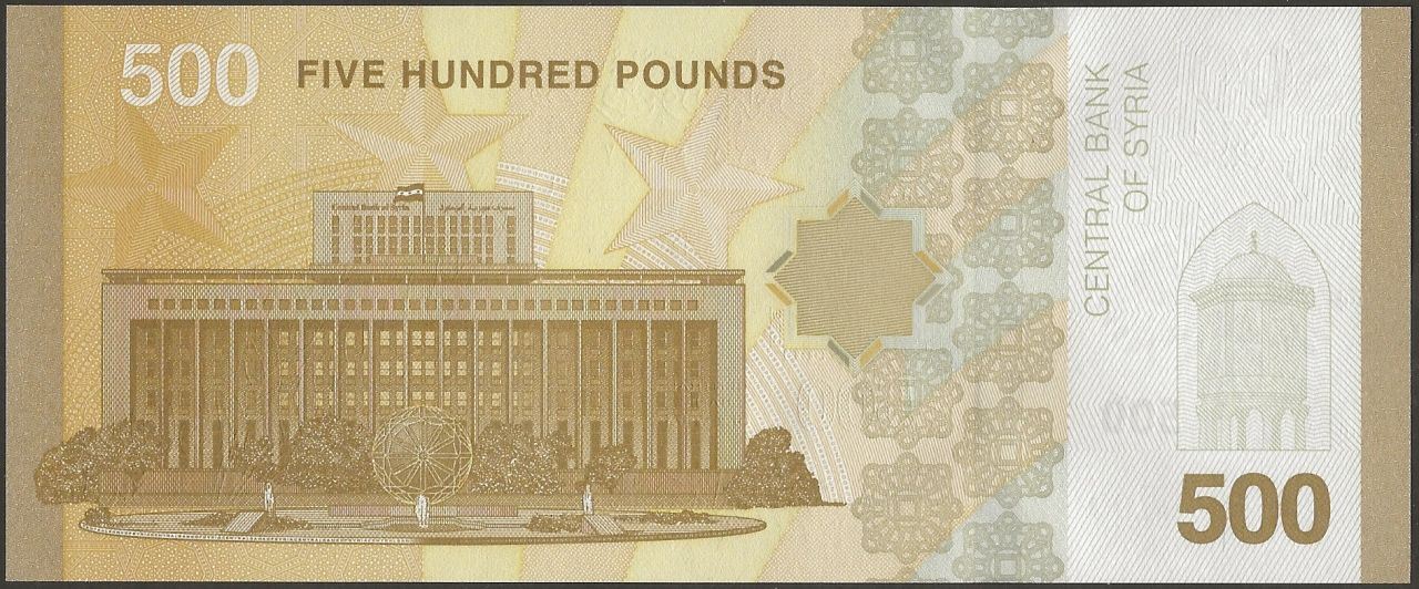 F : unknown bird; eagle with stars, emblem of Syrian Republic; concave hexadecagon as registration device; wheat spikes; Arabesque pattern