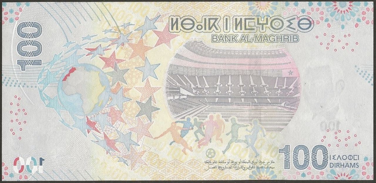 F : denomination in gold OVI; outline map of Africa; Moroccan arabesque motifs; sytlized football in purple OVI; Prince Moulay Abdellah Sports Complex in Rabat;