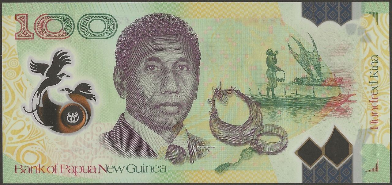 B: Sir Julius Chan; unknown objects; man standing in canoe blowing into conch shell.