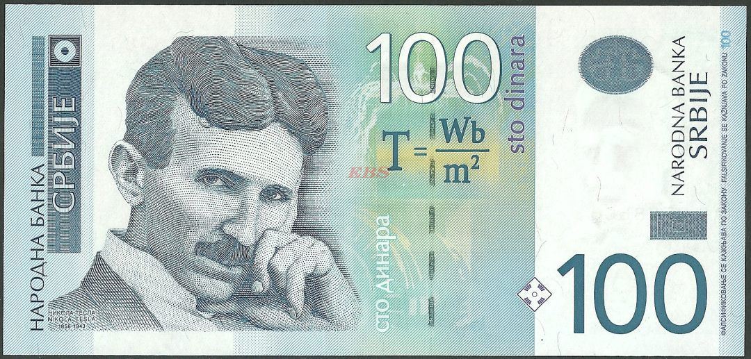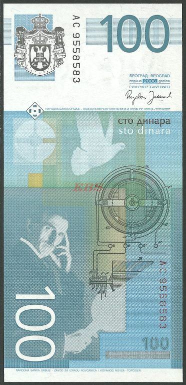 B : (vertical): Serbian text; Republic of Serbia coat of arms; Nikola Tesla; Tesla’s “White Dove” bird; Tesla’s electromagnetic engine.