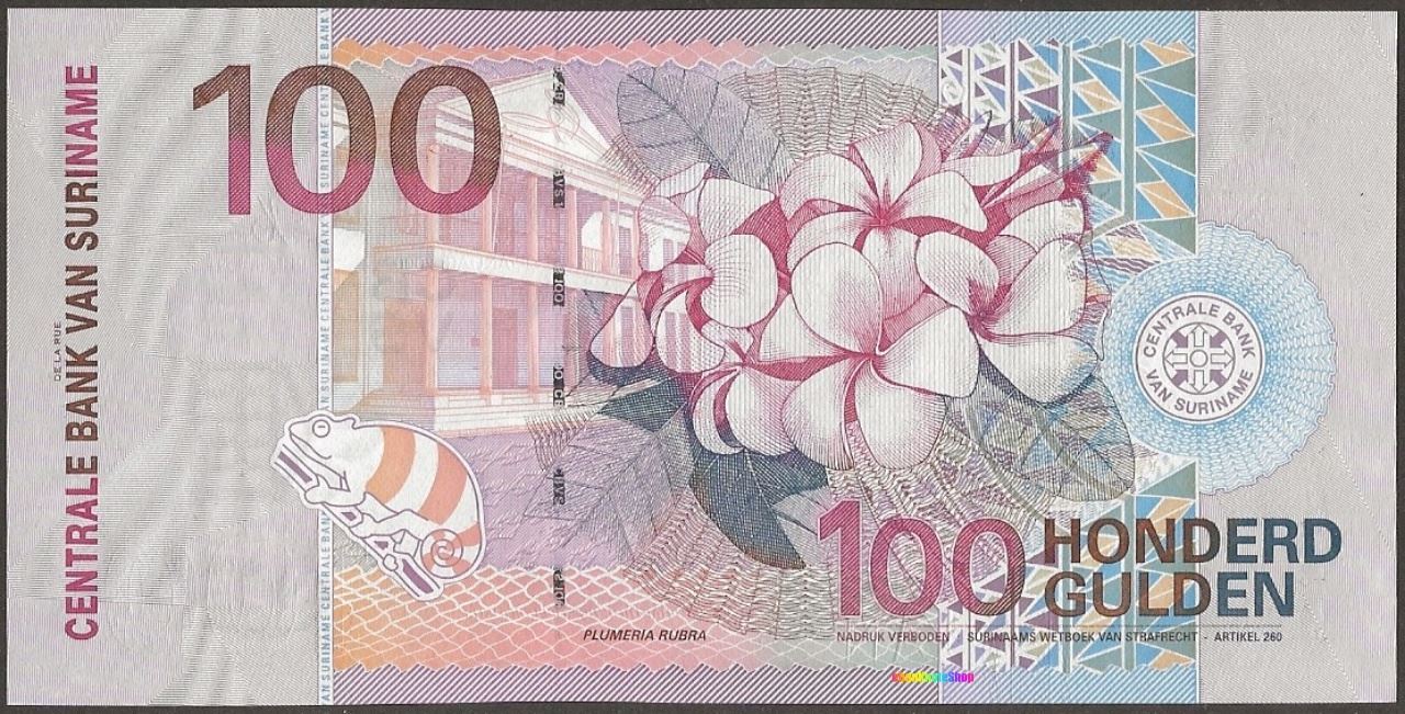 Dutch text; Chameleon; Central Bank van Suriname headquarters building at the Waterkant in Paramaribo; red frangipani flowers; bank logo.