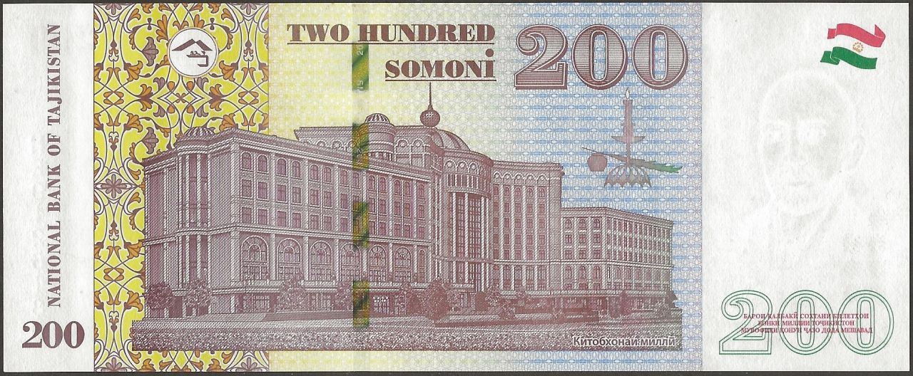 B : English and Tajik text; bank logo; National Library building in Dushanbe; pen, inkwell, and candlestick; flag.