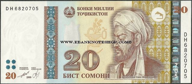 Front :Tajik text; coat of arms; snake and flowers; Abuali ibn Sino (Avicenna), great scientist, encyclopaedist of the Tajik people; bank logo as registration device.