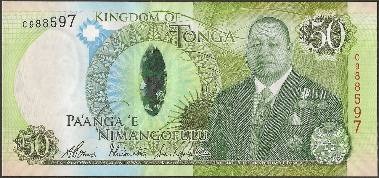 F: English and Tongan text; King Tupou VI; Tongan coat of arms.