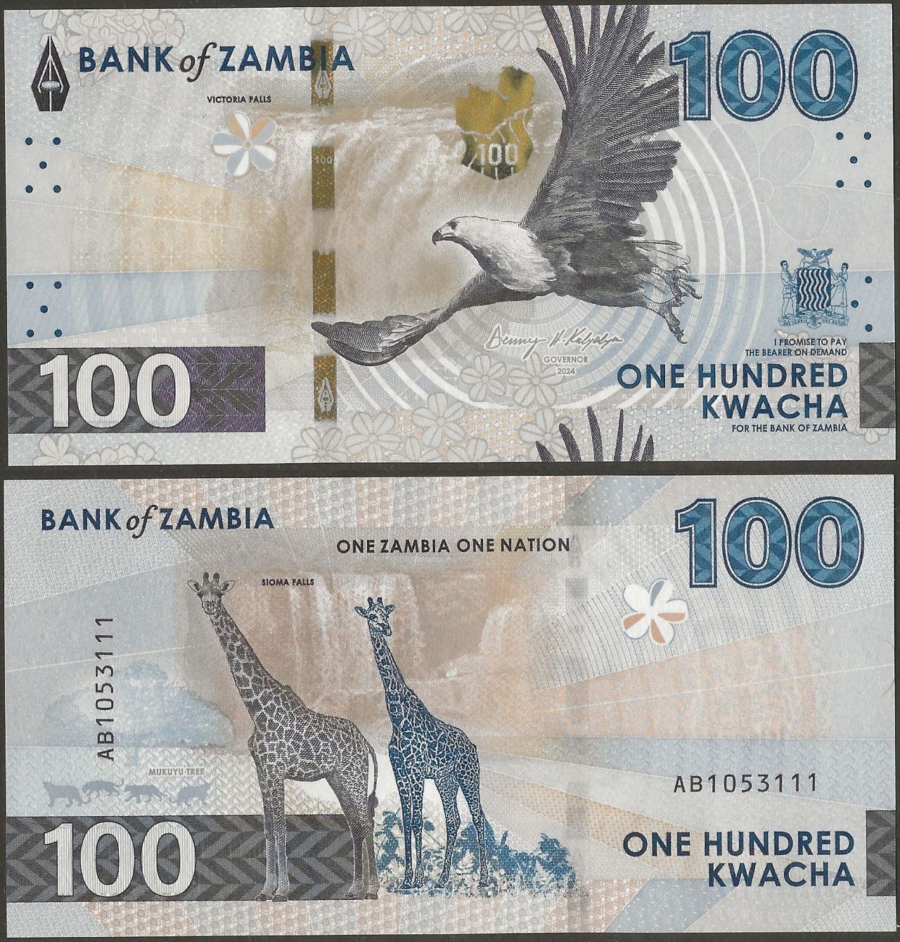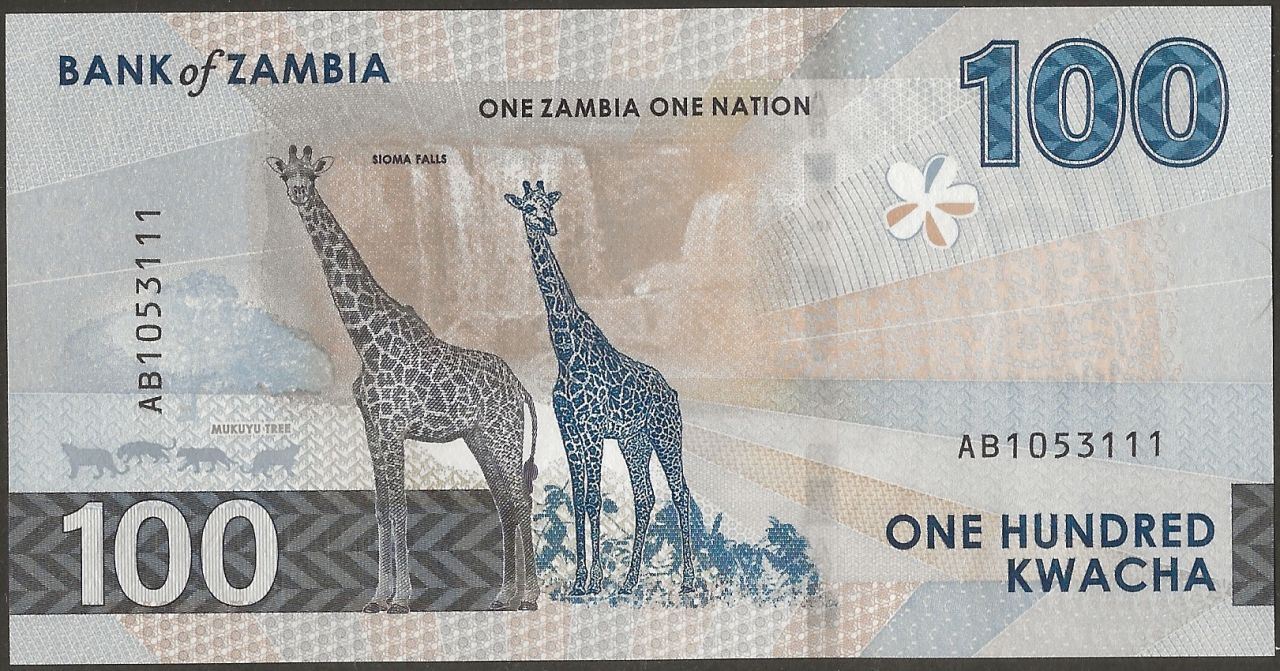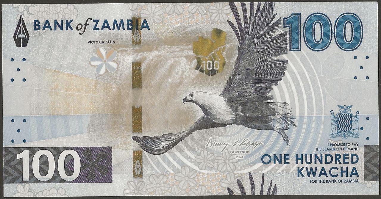 F: Bank of Zambia logo; flower as registration device; unknown economic activity; fish eagle in flight; map of Zambia in OVI; Zambian coat of arms