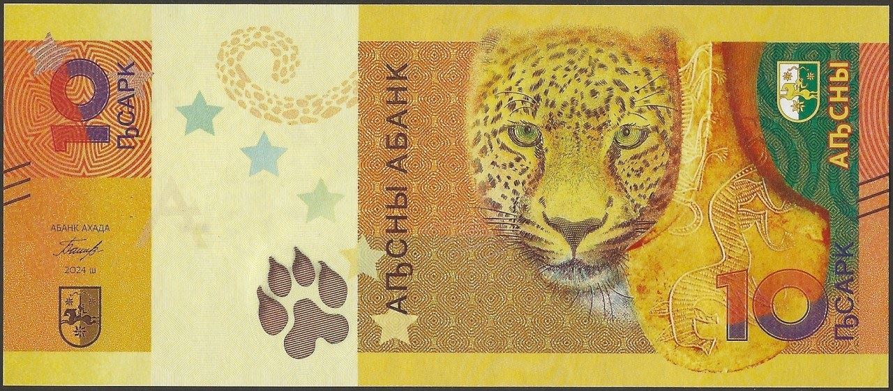 F : Abkhaz text; coat of arms of Abkhazia; apsars symbol; seven 5-pointed stars; paw print; face of leopard; ancient bronze axe with primitive drawing of animal; coat of arms of Abkhazia.