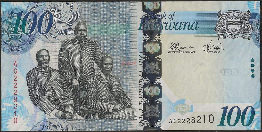 F: English text; three chiefs: Sebele I, Bathoen I, and Khama III;diamond; coat of arms with zebras and shield