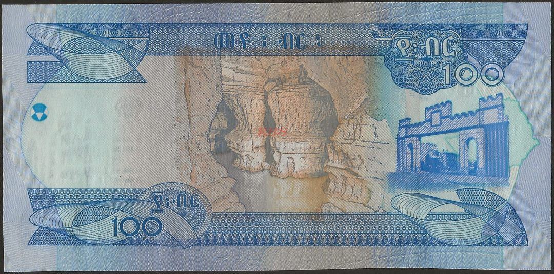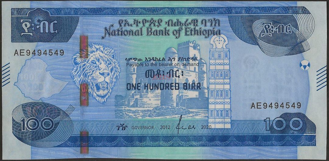 F: Amharic and English text; outline map of Ethiopia; lion head; Emperor Fasilides’ castle in Gondar, Amhara region; Obelisk of Axum.