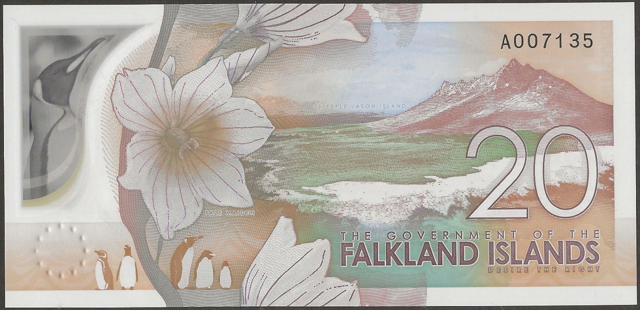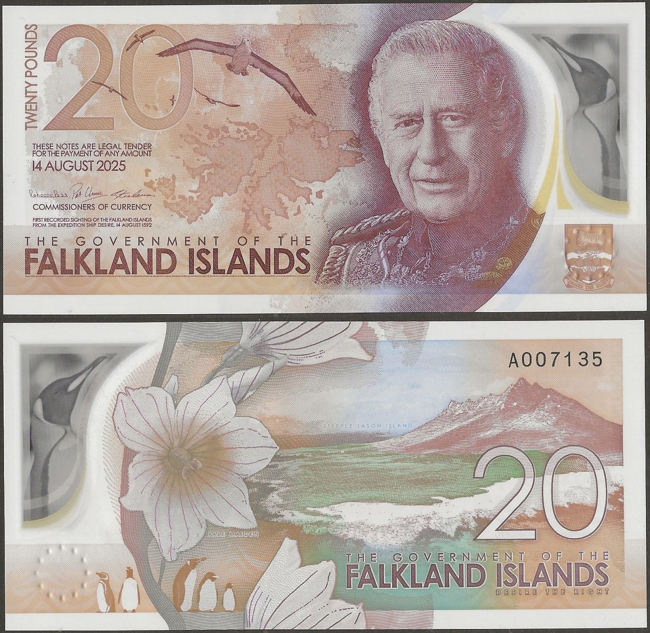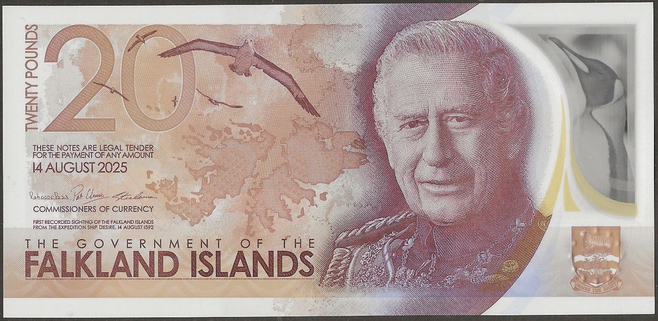 F: five black-browed albatrosses in flight; map of the Falkland Islands; King Charles III; coat of arms