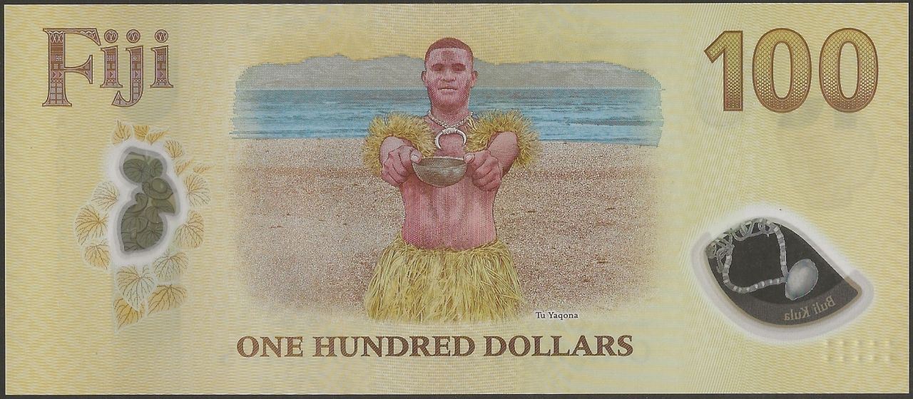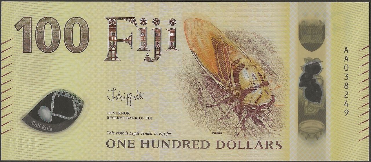 F : nanai (cicada) insect; Fijian coat of arms, leaves, kava bowl.