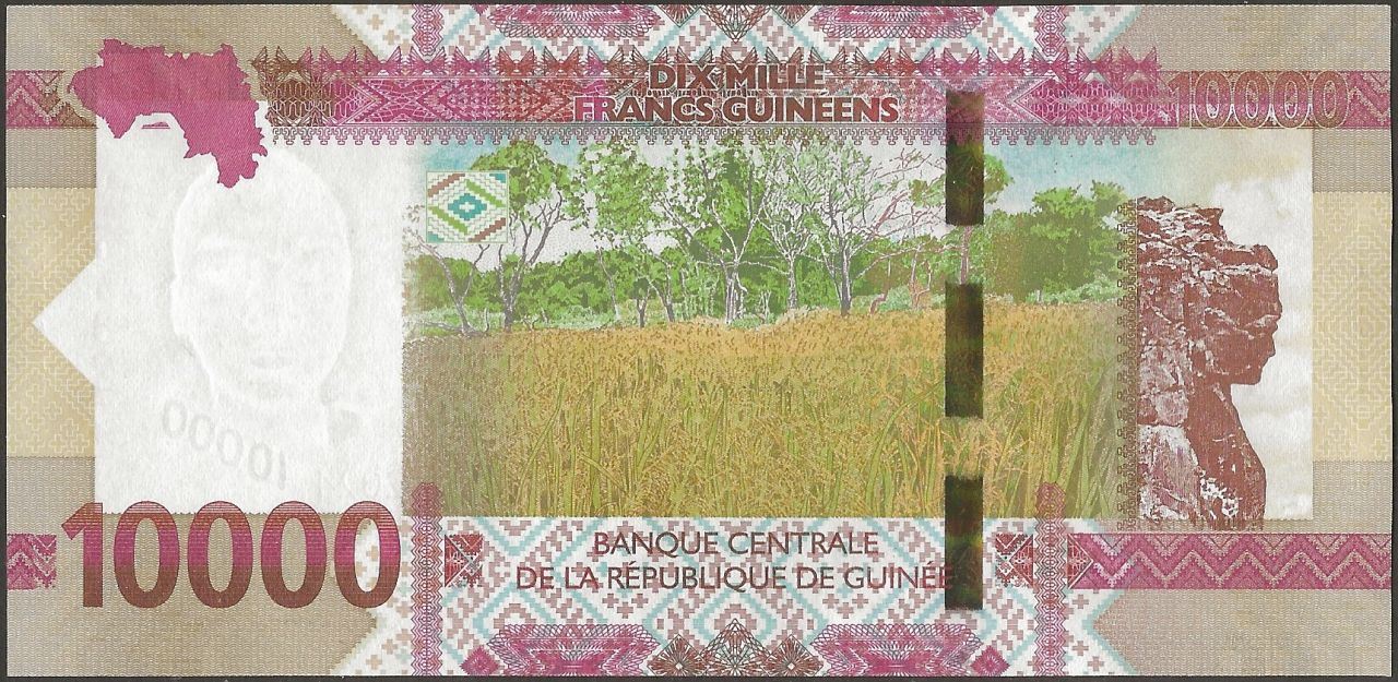 B: map of Guinea; field with trees; “Lady of Maali” rock formation on Mount Loura