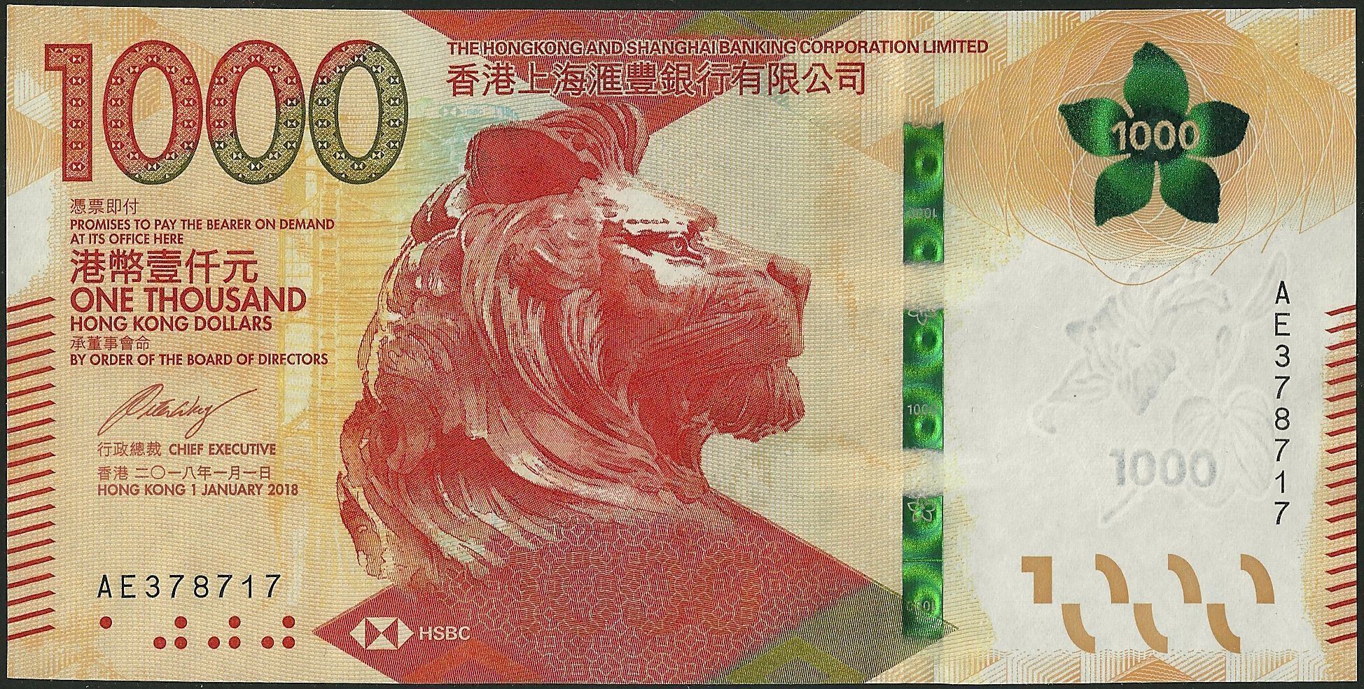 F : Chinese and English text; HSBC headquarters building; HSBC logo; lion statue; denomination as registration device;
