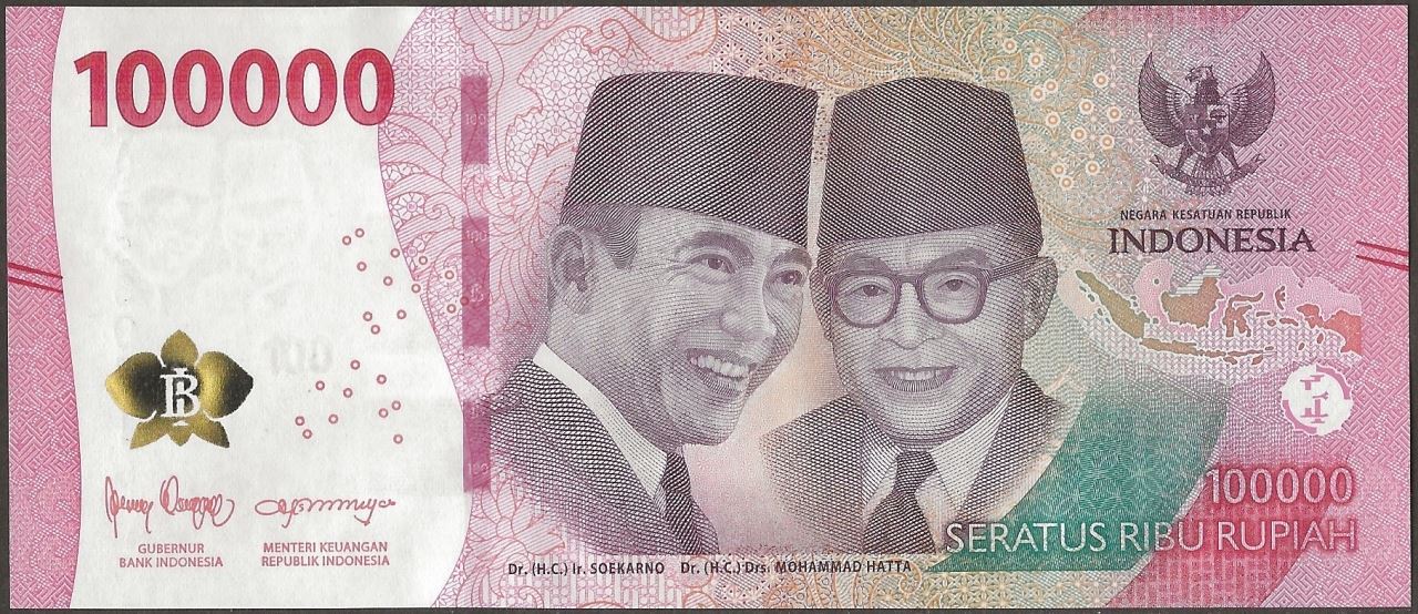 F : Indonesian text; moth orchid flower; 1st president, Sukarno; map of Indoensia; 1st vice-president, Mohammad Hatta; coat of arms; bank logo as registration device.