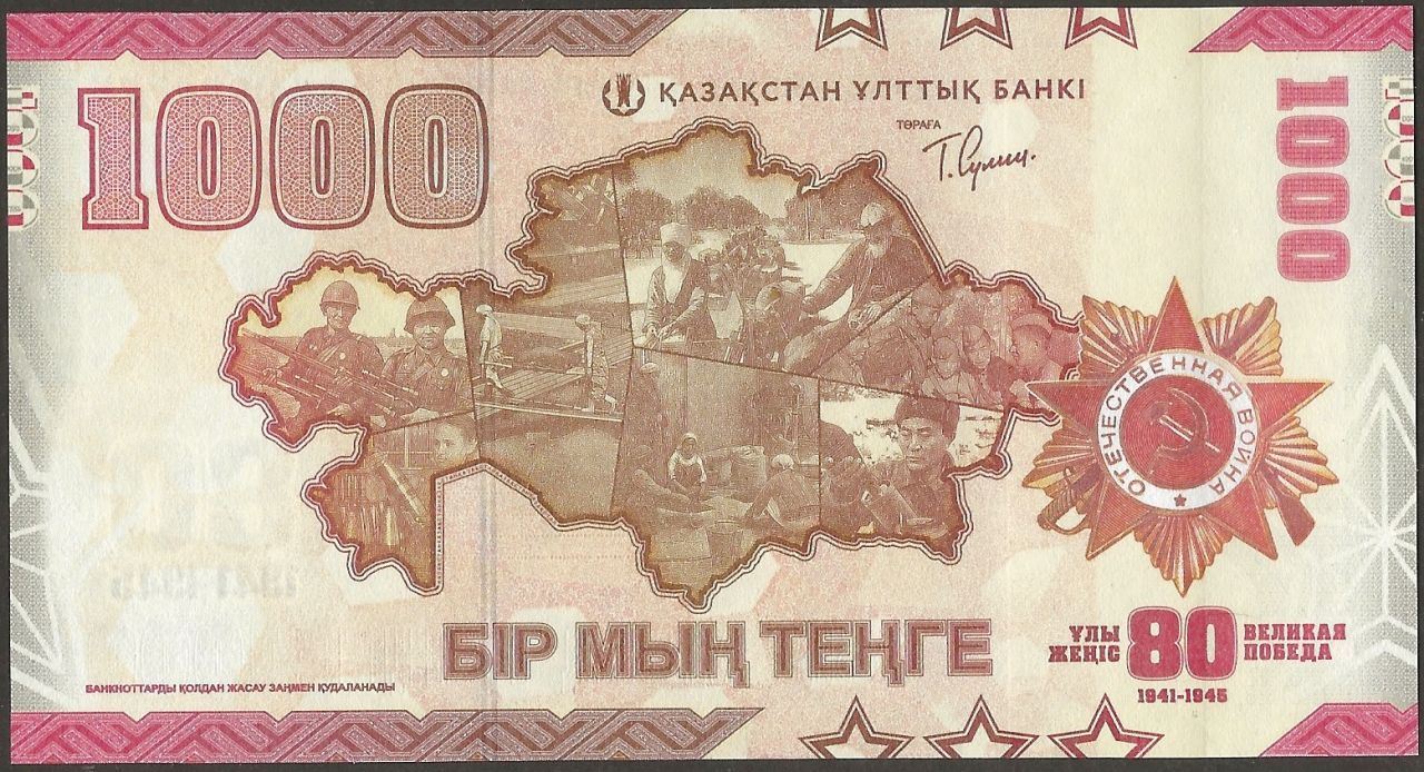 B: outline of the map of Kazakhstan with fragments of historical archival photos; Order of the Patriotic War medal.