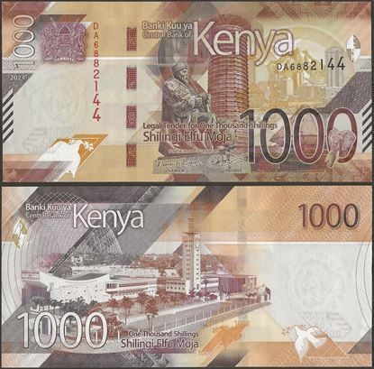 F : Kenya International Conference Centre in Nairobi with seated Kenyatta statue and tower and amphitheater building,Mount Kenya, Buffalo ,English/Kiswahili text , coat of arms.