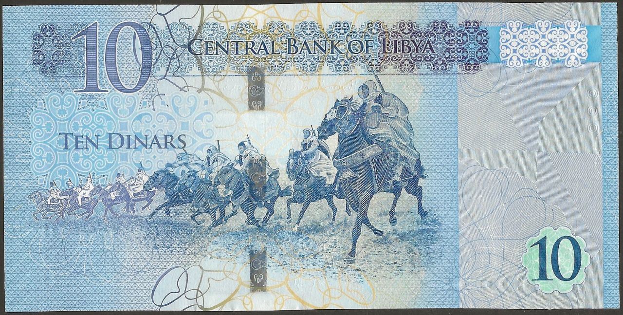 Holographic stripe with Omar Al-Mukhtar, rearing horse, crescent and star, and 10. Windowed security thread with demetalized Arabic characters and horse