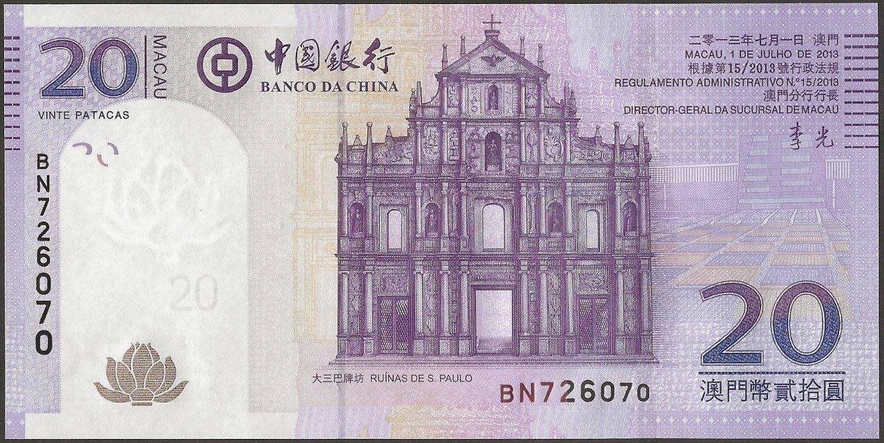 F: Chinese and Portuguese text; denomination as registration device; lotus flower in gold SPARK; bank logo; Ruínas de S. Paulo (ruins of Saint Paul) church building.