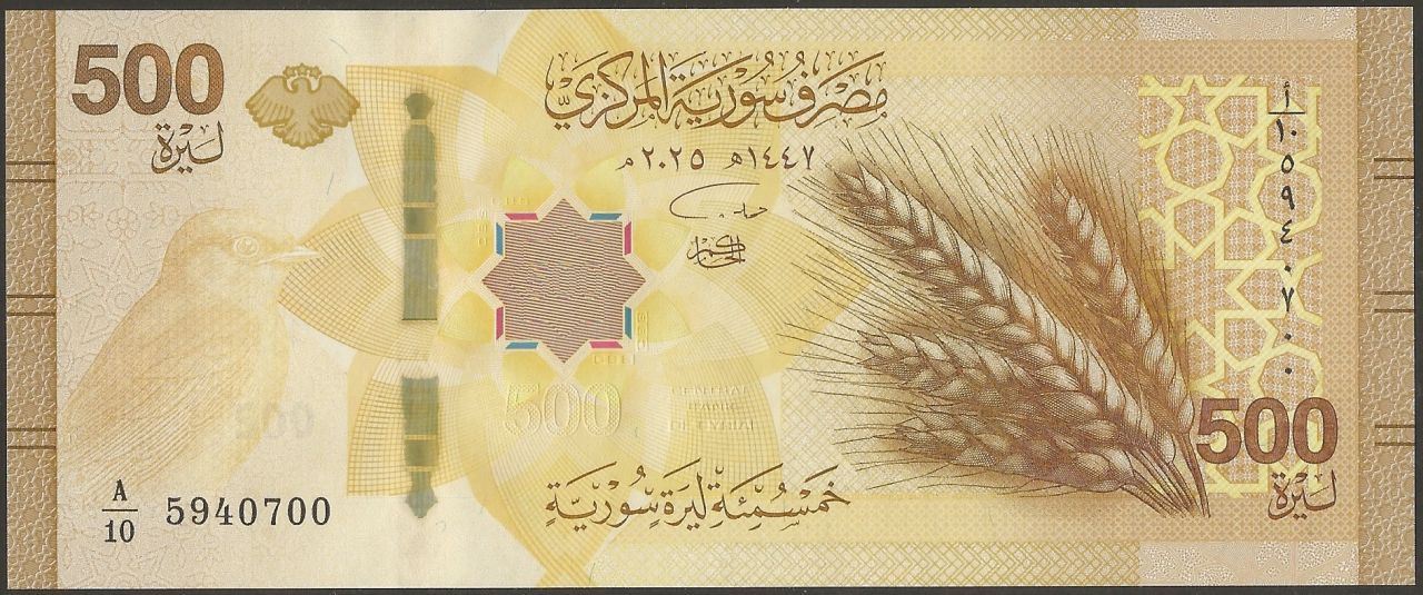 F : unknown bird; eagle with stars, emblem of Syrian Republic; concave hexadecagon as registration device; wheat spikes; Arabesque pattern