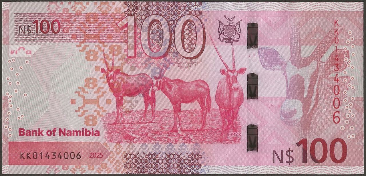 F : Parliament building in Windhoek; Kaptein Hendrik Witbooi; bank logo in magenta-to-green SparkLive; BON as registration device.