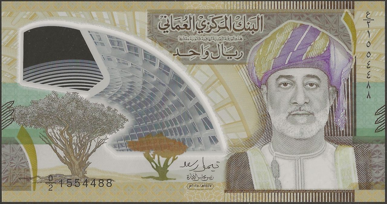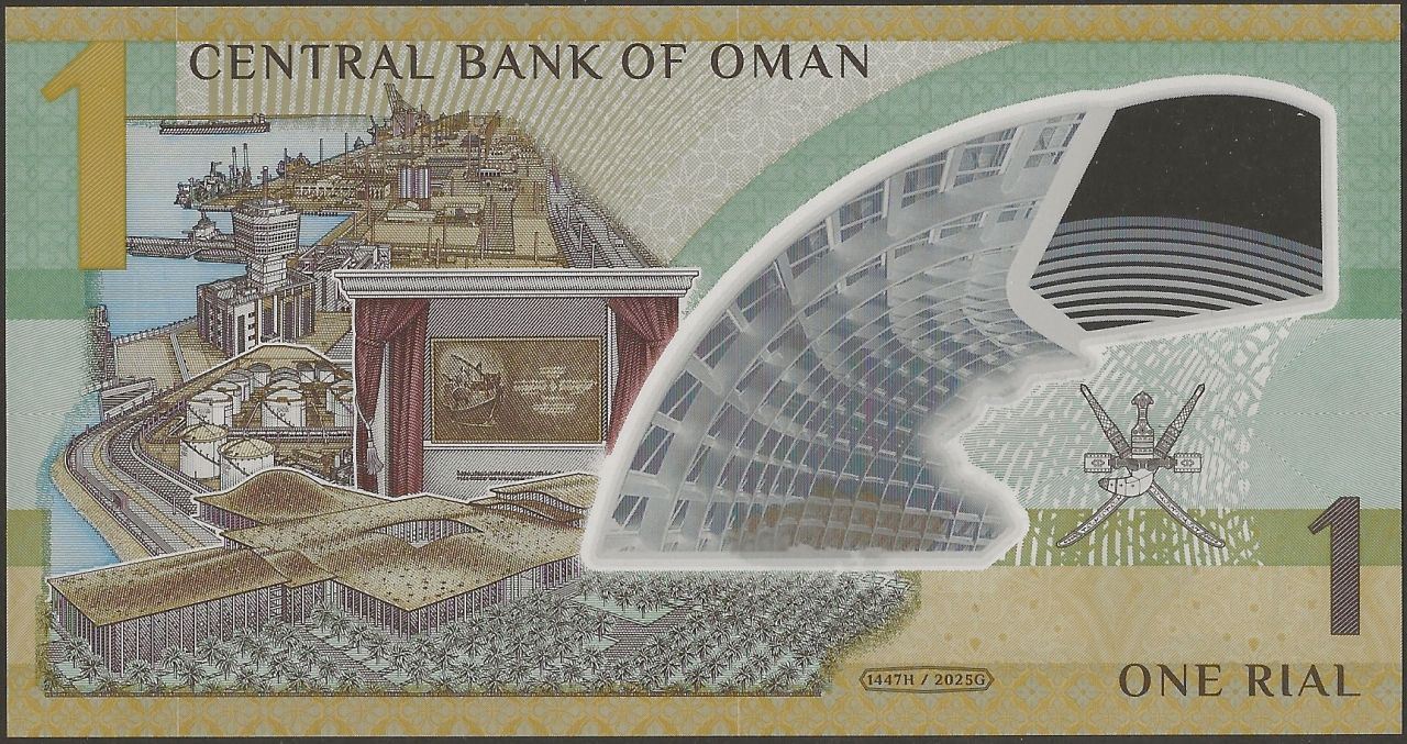 Back: Duqm Port; Duqm Refinery; Sayyid Tarik bin Taimour Cultural Complex; arched windows of the Oman Botanic Garden; coat of arms with crossed swords and khanjar (dagger)