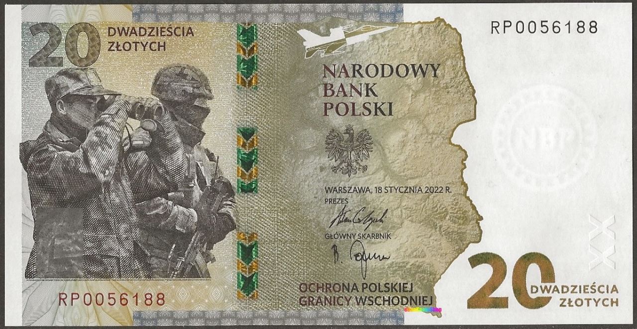 F: Polish text; Border Guard officer holding binoculars and Polish Army soldier holding assault rifle, both wearing camouflage uniforms; coat of arms with crowned eagle; fighter jet as registration device; map of Poland’s eastern border; denomination in SPARK Live.