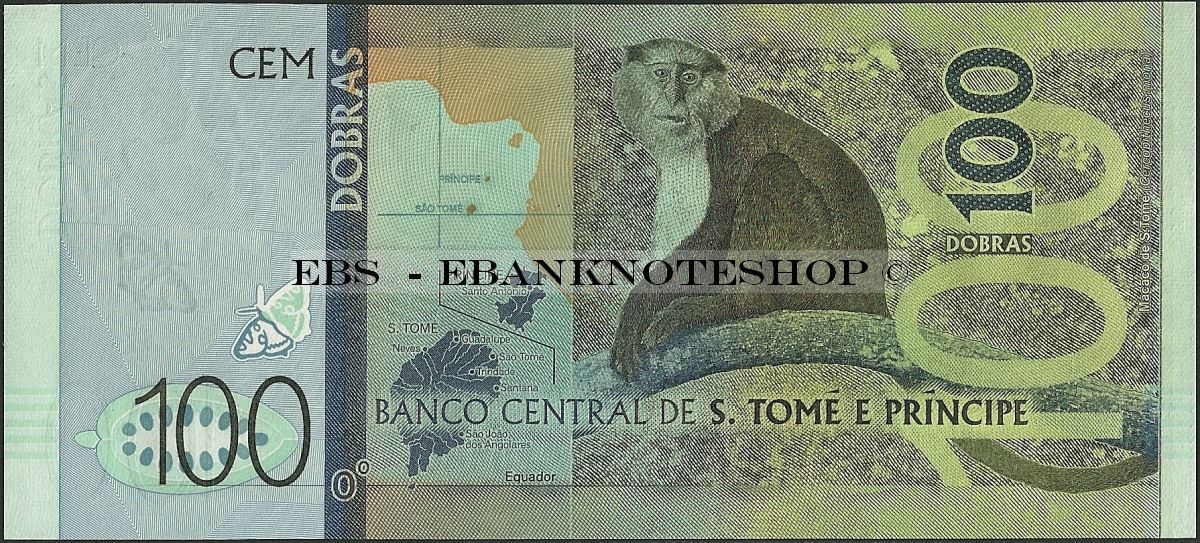 Front: Portuguese text; Charaxes odysseus butterfly; coat of arms; Banco Central headquarters building in São Tomé; holographic patch; butterfly as registration device.