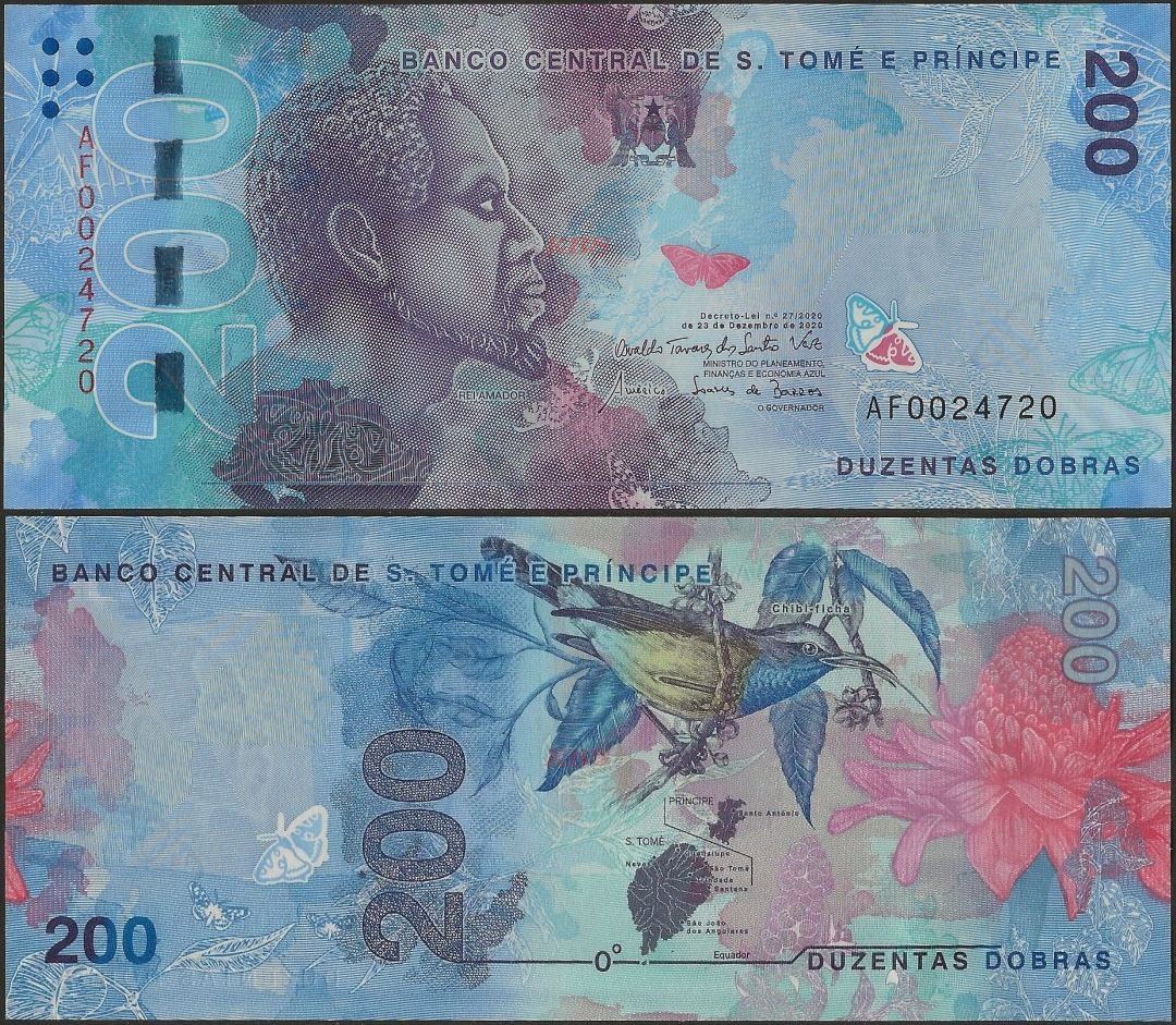 B: Portuguese text; butterflies; Chibi-ficha Príncipe sunbird perched on branch; map of Sao Tome and Principe; flower.