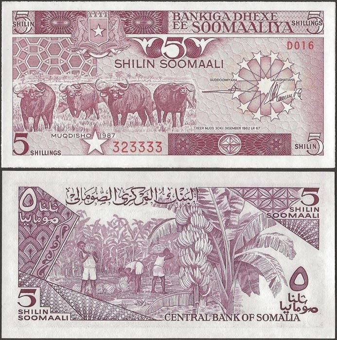 F : English and Somali text; six cape buffalo; coat of arms; star