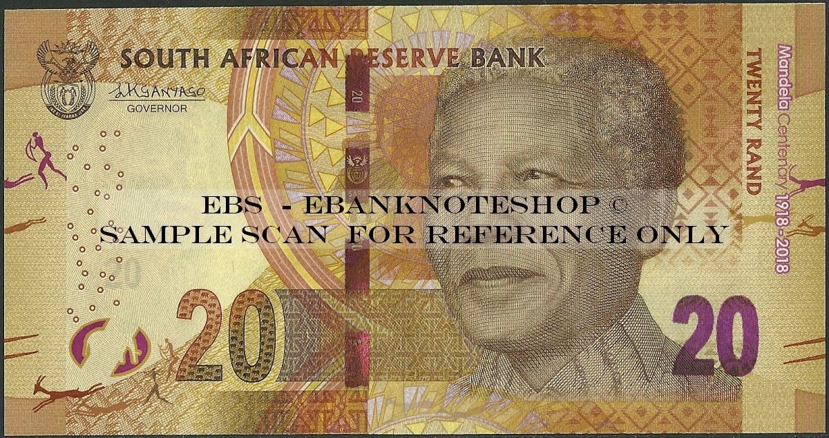 B: Text in English, Southern Ndebele, and Tswana; young Madiba wearing traditional attire; Mandela House in Soweto. Holographic windowed security thread with coat of arms, SARB, and 20 RAND.