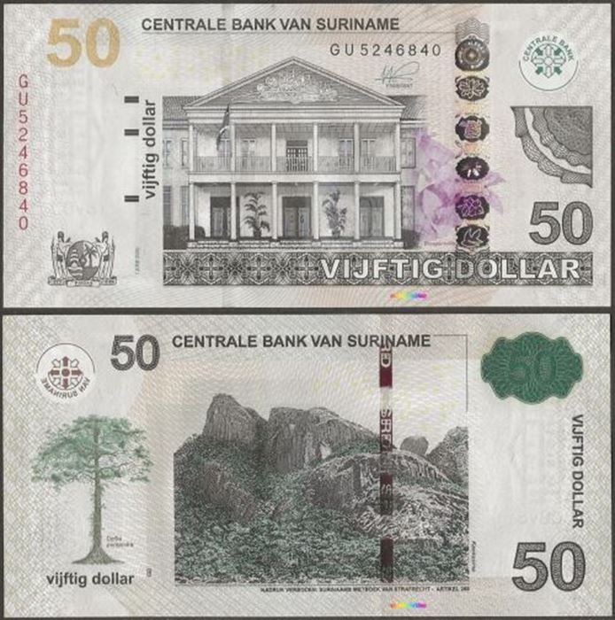F: Dutch text; coat of arms; Central Bank van Suriname headquarters building at the Waterkant in Paramaribo; bougainvillea flower; bank logo registration device.