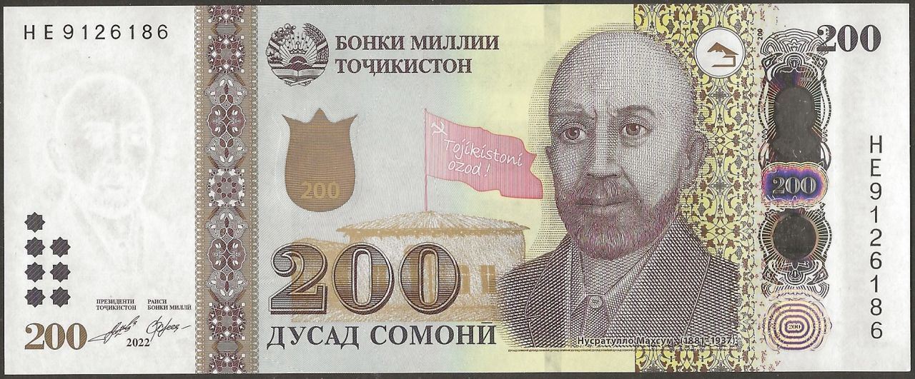 F: Tajik text; coat of arms; building with red flag; Nusratullo Makhsum, hero statesman; bank logo as registration device.