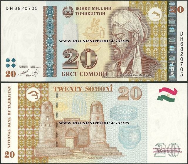 Front :Tajik text; coat of arms; snake and flowers; Abuali ibn Sino (Avicenna), great scientist, encyclopaedist of the Tajik people; bank logo as registration device.