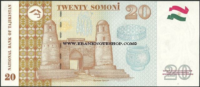 Back : English and Tajik text; bank logo; Hissar Castle; flag