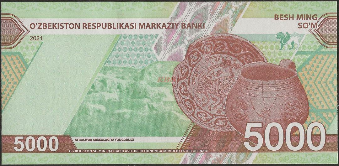 F: Uzbek text; denomination in magenta-to-green OVI; winged leopard as registration device;